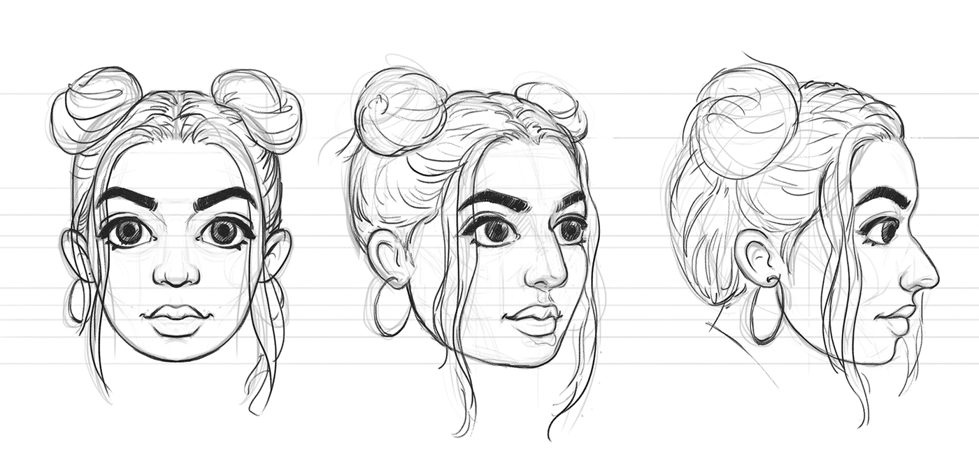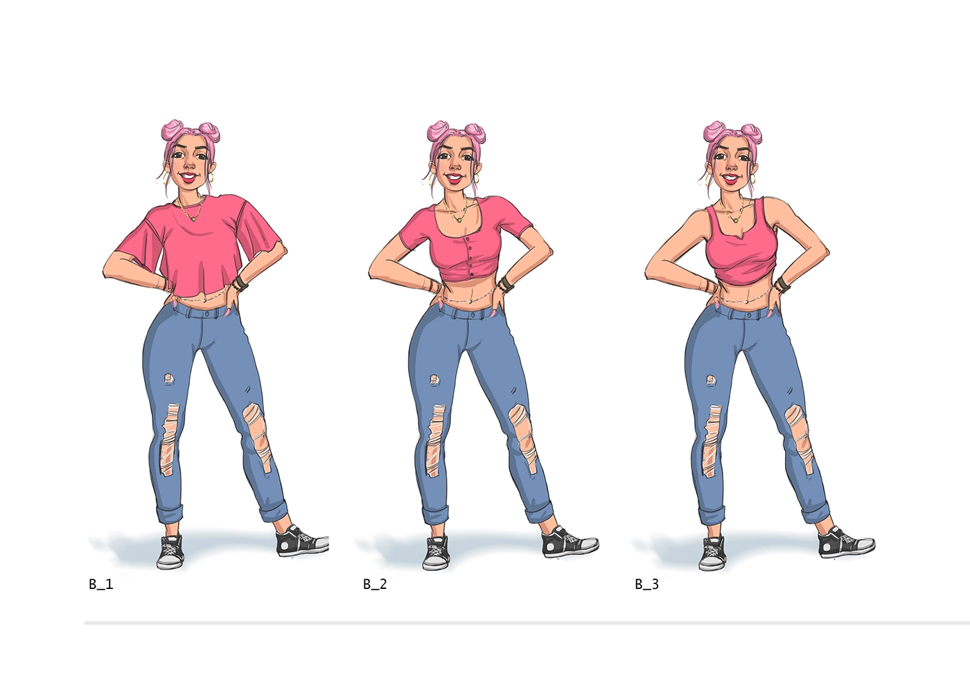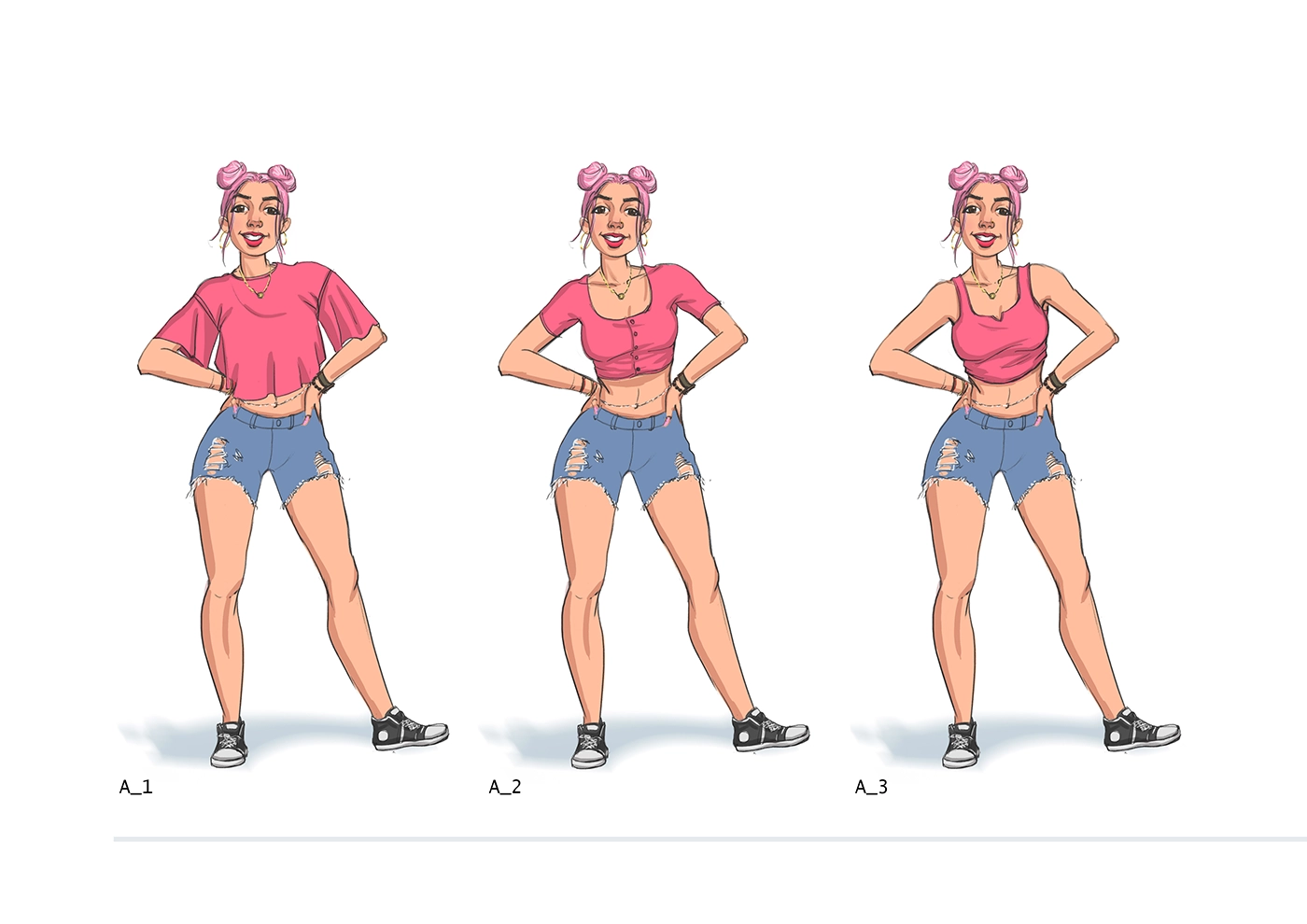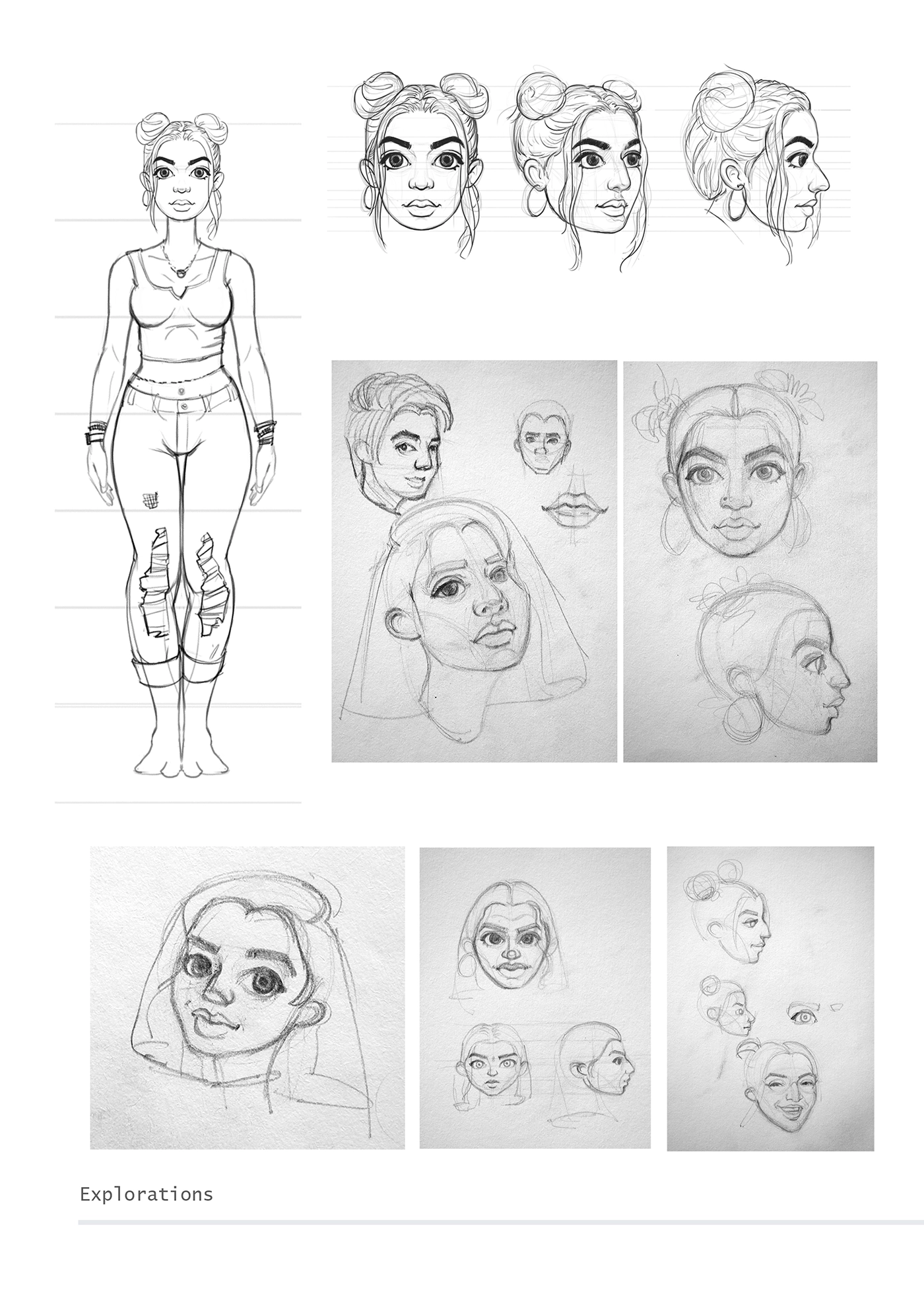 -Detailed 2D character design boards demonstrating the full development process, from initial concepts to final iterations, with careful attention to design refinement.